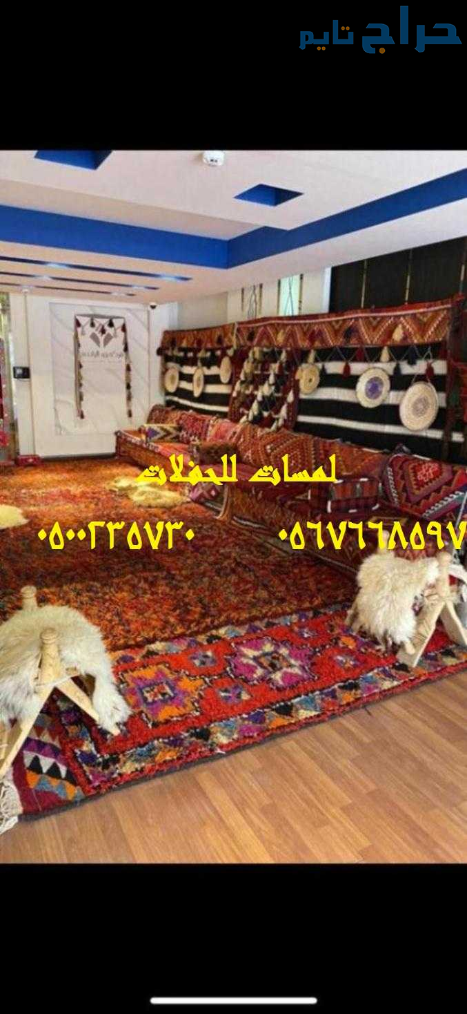 ?مؤسسة لمسات للحفلات تقدم: تجهيز حفلات,تزين قاعات افراح,ايجار جميع انواع المجالس, جلسات ارضيه تاجير طاولات كوكتيل متوفرة بالأنواع : مضيئة , تلبيسة , حديد مع خشب , بللور , تاجير كنب جلد , تاجيرمكيفات خيام متوسطةللايجار, خيام كبيرةللايجار, ايجار كنب ملكي خدمات تنظيم الاحتفالات ,كنب جلد ابيض كراسي فندقية , طاولات طعام وبوفيه , طاولات اجتماعات تزين قاعات,ايجار جميع انواع المجالس, جلسات شالكي الوان مختلفه ايجار خيام,كنب شعبي,ايجار كنب ملكي, ايجار تراثيات تاجير دفايات فيصليه وعاديه وتاجير خيام شفافه وجلسات مودرن تنظيم وتأجير لوازم المناسبات والاحتفالات العامه والخاصه اختار ما يناسبك من الصور للتواصل معنا على الارقام التالية: 8597 766 056 730 235 00 05
