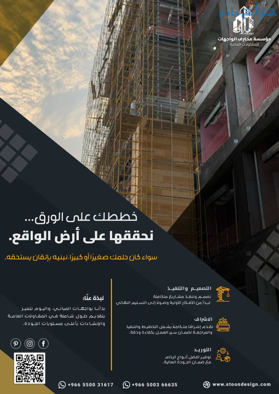 نتشرف في مؤسسة محترف الواجهات للمقاولات العامة بالتواصل معكم، رغبةً في بحث فرص التعاون المشترك في مجالات المقاولات والخدمات الإنشائية.