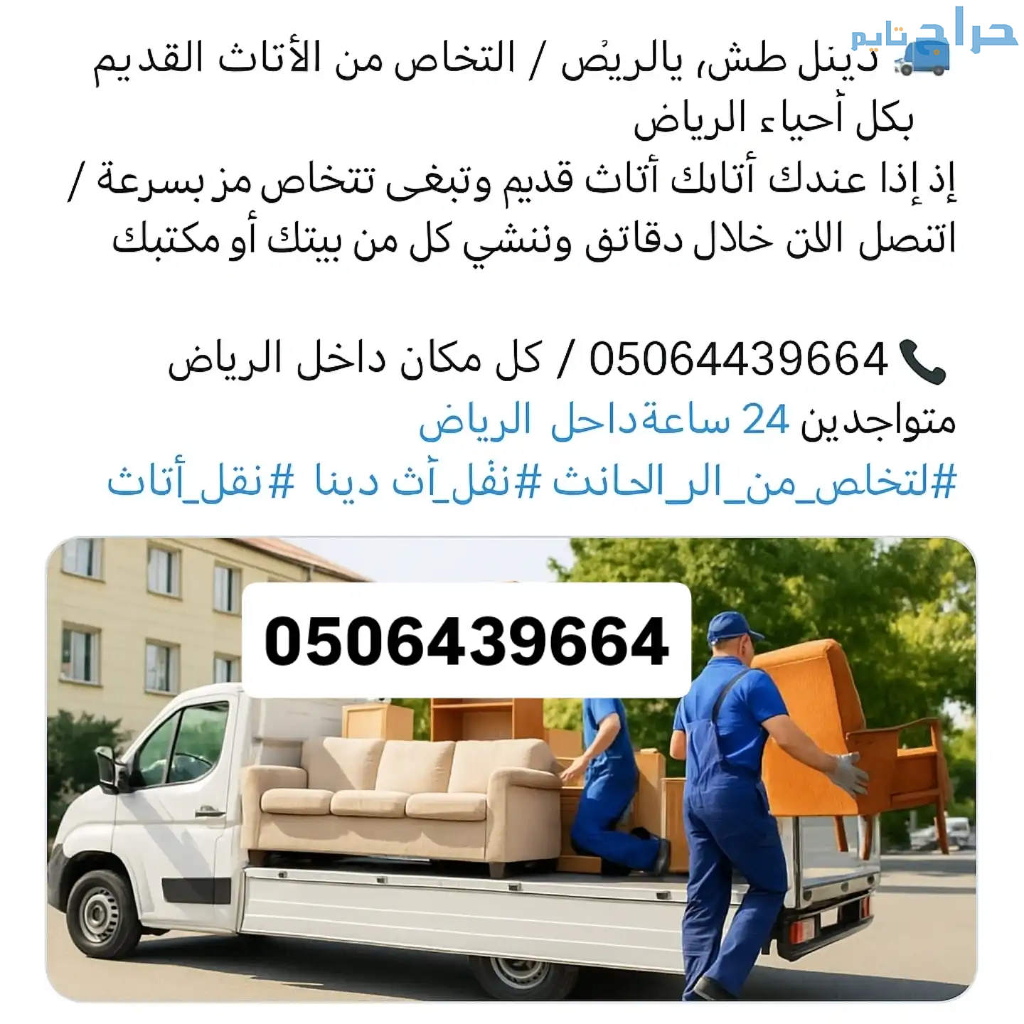 ☎ 0506439664 / خل الرقم عندك، وخلنا نجي نخلّصك من الزحمة والأغراض اللي ما تحتاجها / نشتغل بجودة وثقة وفي كل حي بالرياض / كل مكان نوصله / دينا التخلص من الأثاث القديم بالرياض الأفضل في المجال ونخدمك من القلب /